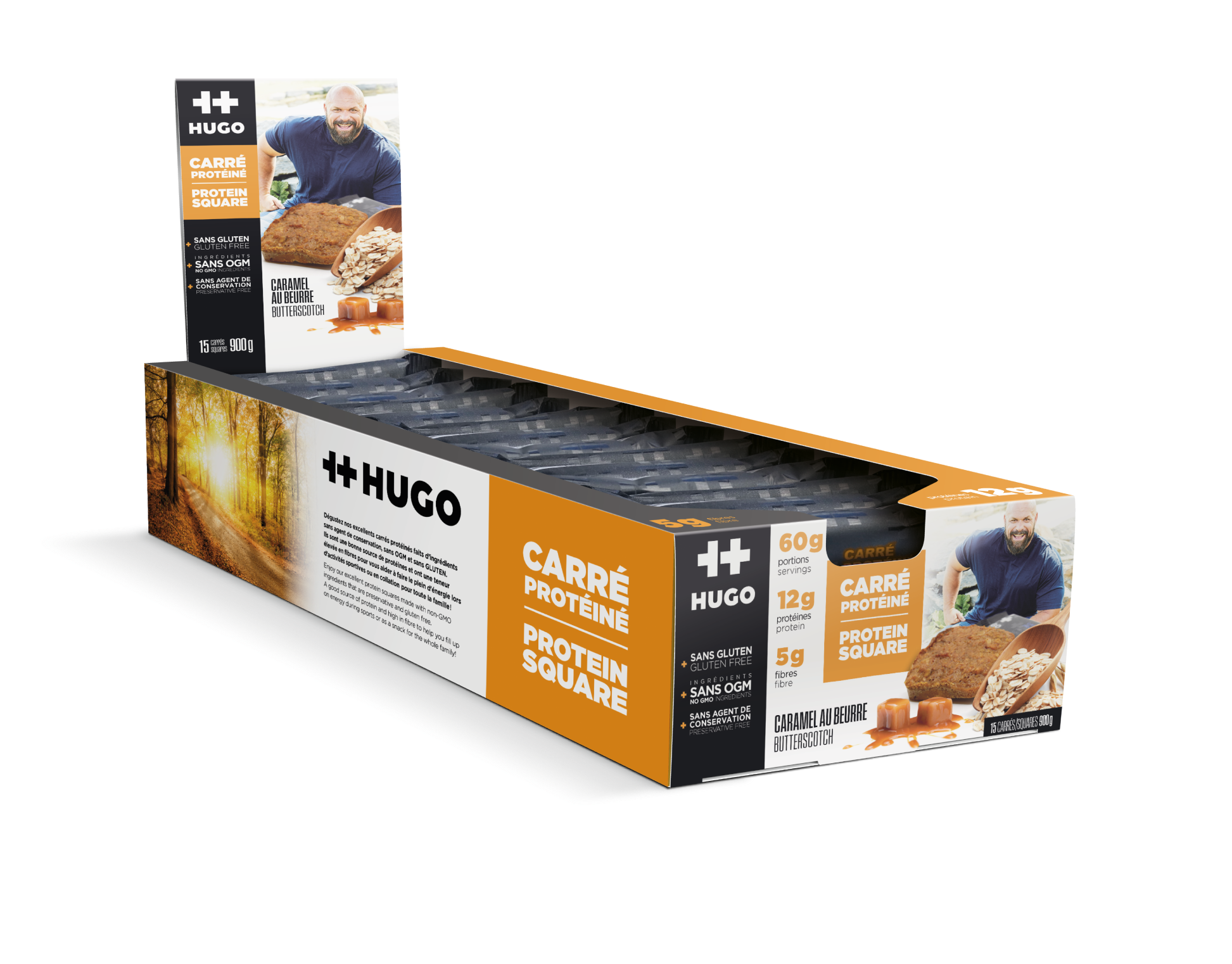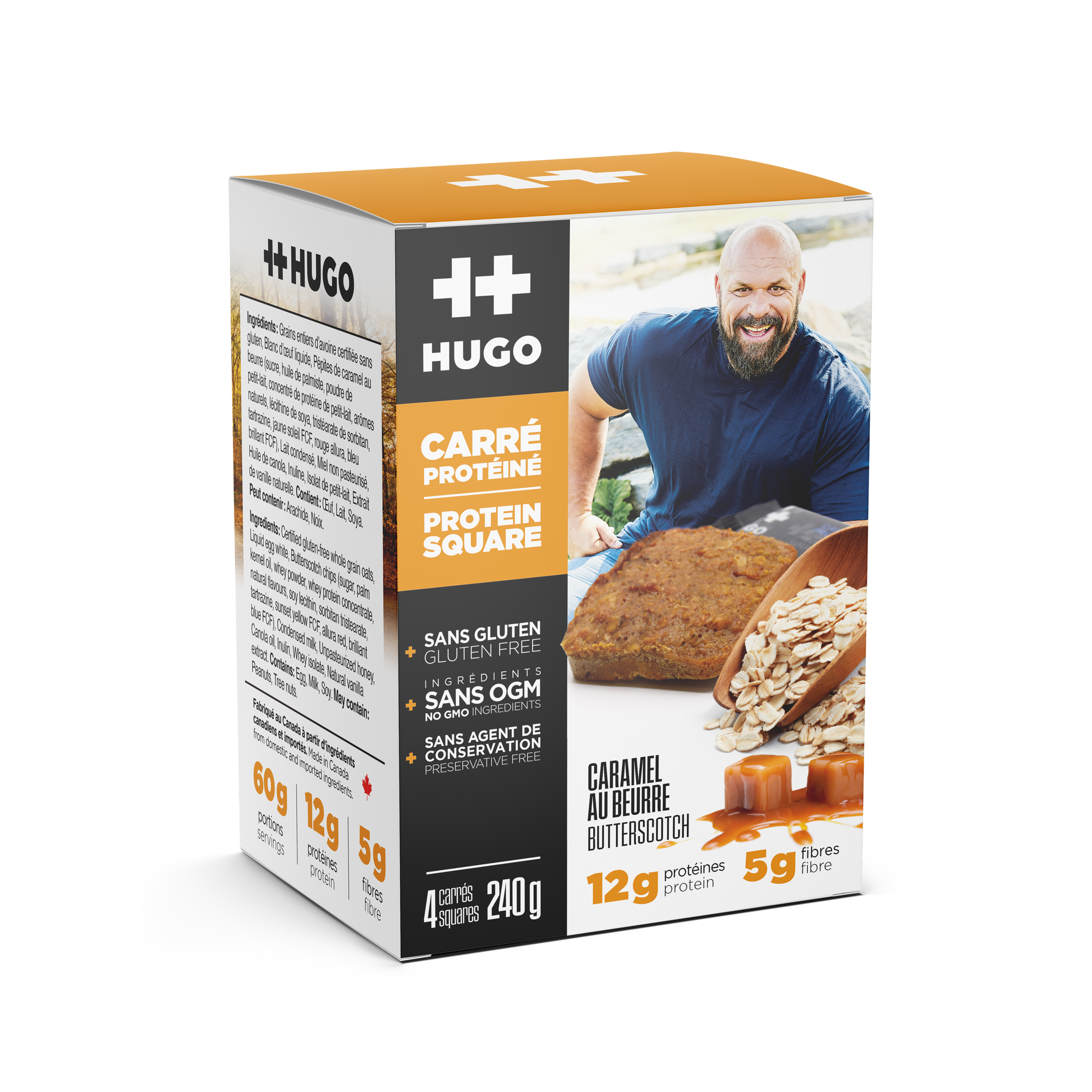 Carré protéiné disponible en 5 saveurs, sans gluten, 100% naturel, fait avec des ingrédients sans OGM, sans agent de conservation.